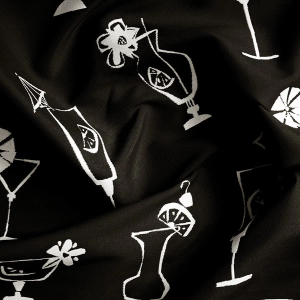Bring a fun, festive spirit to your patio with Covington Outdoor Five O’Clock Somewhere upholstery fabric. Five O’Clock Somewhere Ivory/Ebony features a black design of various cocktails on a white background. Add this 100% polypropylene indoor/outdoor fabric to your patio or outdoor living space and you’ll be the hit of the next neighborhood barbecue! The fabric is also reversible, giving you another reason to love this quirky and beachy fabric.